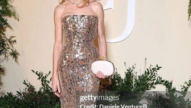 Супермодель и жена сына миллиардера Антуана Арно выбрала для статусного мероприятия золотой наряд от Schiaparelli, украшенный множеством бусин и пайеток, которые напоминают осколки зеркала. Наталья Водянова дополнила образ белым овальным клатчем и драгоценностями — серьгами и колье с желтыми бриллиантами от Chopard.