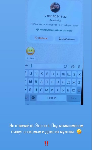 Анастасия Решетова на своей страничке в социальной сети сообщила о злоумышленниках, которые действуют от ее имени. Блогер рассказала, что неизвестные взяли телефонный номер, к которому привязали ее имя и фотографии, и от ее имени делают рассылки по ее знакомым. Об этом пишет издание super.ru.