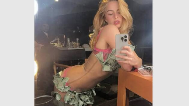 25-летняя блогерша снялась в прозрачном платье, прикрыв тело фейковыми долларами. Автором наряда выступили лондонские дизайнеры Наташа Сомервилл и Франческа Каппер, которые четыре дня вручную пришивали банкноты к платью знаменитости.