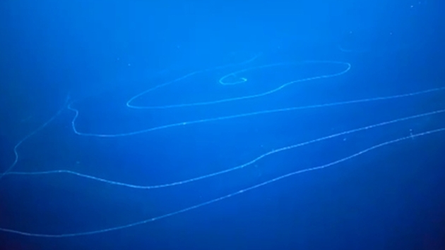 Хищник, заснятый в Индийском океане с помощью глубоководного аппарата, достигает 50 метров в длину. Диаметр его внешнего кольца составляет 15 метров.