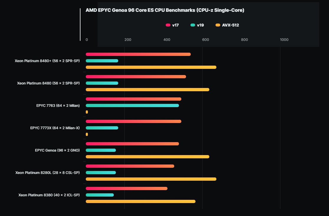 В социальные сети утекли первые результаты тестов флагманской модели EPYC Genoa — мощнейшего 96-ядерного процессора AMD, предназначенного для серверной инфраструктуры. Если верить бенчмаркам инженерного экземпляра, новинка бьет все рекорды в плане производительности для архитектуры х86. Результаты проверок в V-Ray, CPU-Z, разных версиях Cinebench и других программах показывают, что в однопоточных тестах EPYC Genoa отстает от конкурентов, однако в многопоточных превосходит не только Ryzen Threadripper, но и аналогичные процессоры Xeon Platinum от Intel — причем отрыв по производительности порой достигает 47%.
