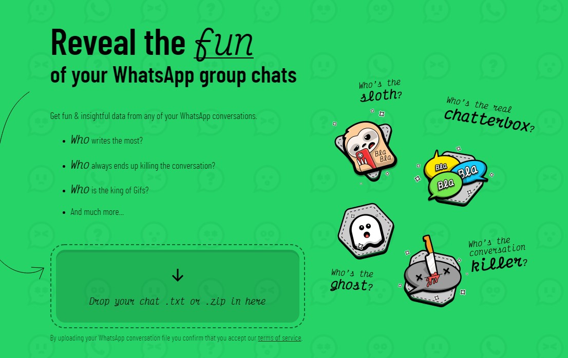 Кто самый разговорчивый в группе? Сколько сообщений вы отправили товарищу? В какое время дня ваши чаты наиболее активны? WhatsAlysis и WhosWhat ответ на эти вопросы при помощи наглядных графиков. Оба приложения способны анализировать как индивидуальные, так и групповые диалоги, но для этого вам понадобится экспортировать историю сообщений и загрузить файл на сайт. Разница между площадками заключается в мелочах, вроде отдельных пунктов статистики: так, например, WhosWhat подмечает, после каких сообщений диалоги чаще всего прерывались.