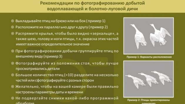 Как отметили чиновники, фотографировать птиц нужно, чтобы помочь науке— ведется сбор информации поиспользованию ресурсов водоплавающей иболотно-луговой дичи. «Фотографии добытых птиц помогают оценить охотхозяйственное значение разных видов наоснове обработки информации массового материала»,— объяснили вкомитете.