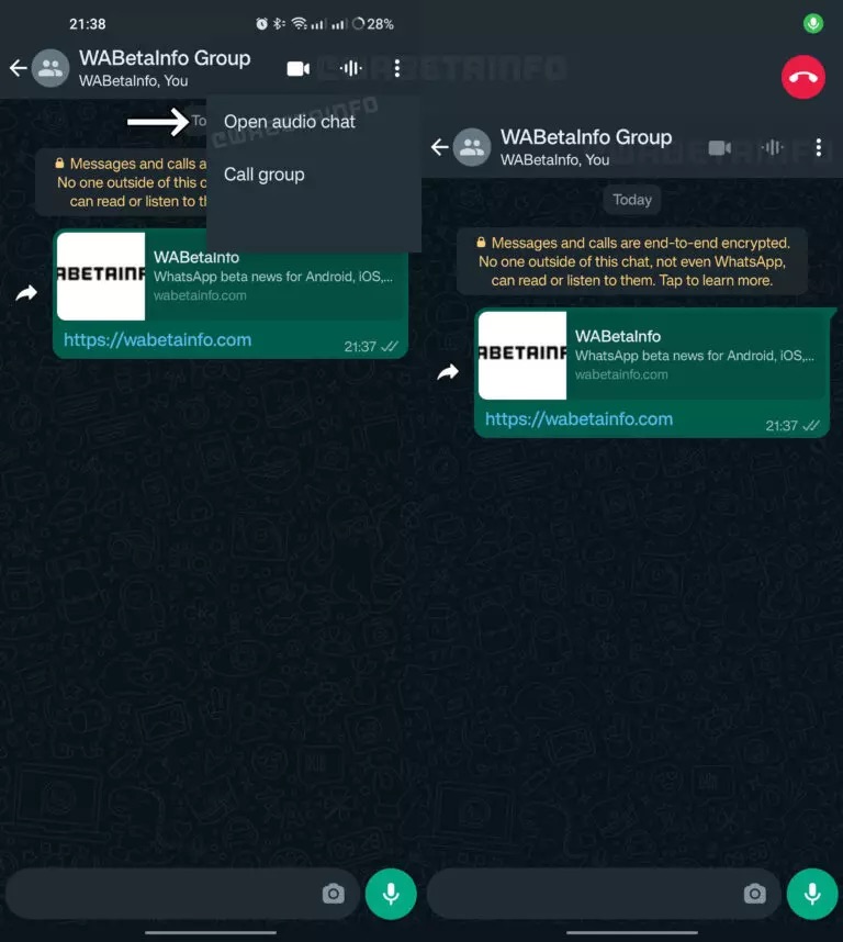 Судя по имеющемуся скриншоту, в заголовок чата будет добавлена новая иконка в форме звукового сигнала. Если на неё нажать, то начнётся голосовой чат. К сожалению, пока нет официальной информации о том, как будет работать эта функция.