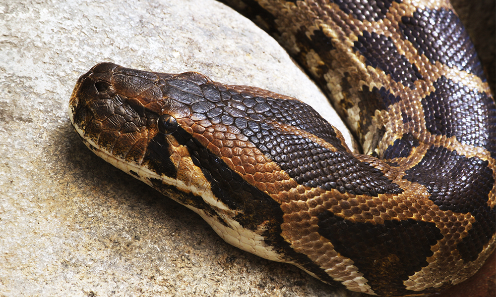 Самая большая африканская змея. Иероглифовый питон — грозный член семейства удавов, который в дикой природе питается, например, обезьянами и крокодилами: длина до 6 метров позволяет им охотиться на большую добычу. Их также можно узнать по характерным треугольным узорам под глазами и острым зубам.