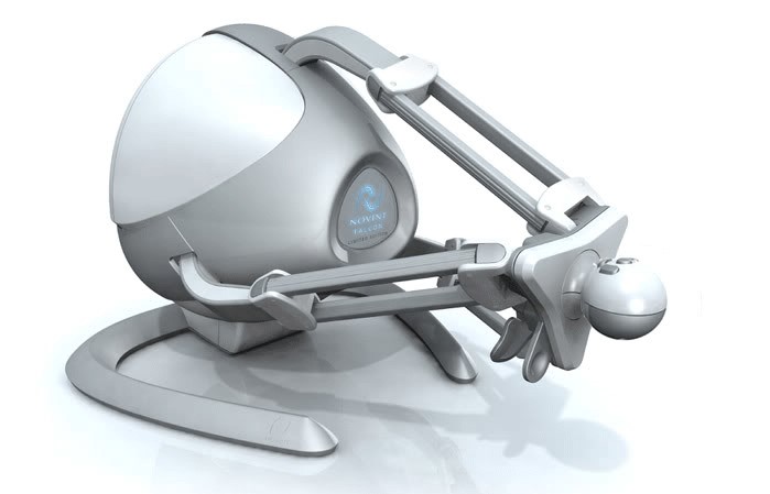 Novint Falcon отдаленно напоминает GLaDOS — антагониста серии игр Portal. Да и работает «мышь», если ее вообще можно так назвать, не менее хитроумным способом. Novint Falcon представляет собой устройство тактильного отклика. Маленький ролик закреплен на трех балках, каждая из которых подключена к чувствительному моторчику. Работая одновременно они воспроизводят ощущение текстуры, формы, массы и динамики виртуальных объектов. По меркам 2007 года, когда устройство попало на прилавки, идея была новаторской — правда, стоило оно неподъемно дорого. К тому же, гаджет не нашел поддержки среди разработчиков игр.