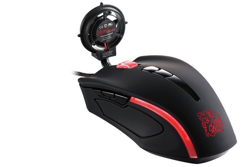Фирма Thermaltake известна своими продуктами в сфере компьютерного охлаждения. Поэтому неудивительно, что она также выпустила мышь со встроенным вентилятором. Black Element Cyclone имеет миниатюрный отделяемый вентилятор, который призван охлаждать руку, держащую мышь. Но в остальном она была представителем сегмента стандартной геймерской периферии: высокое разрешение сенсора, настраиваемая подсветка и дополнительные клавиши, грузики для повышения массы… Иными словами, вентилятор — просто гиммик в довесок к неплохой мыши.
