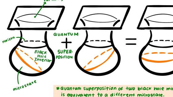 В квантово-механическом мире энтропия связана с микросостояниями, находящимися в суперпозиции, которые в больших масштабах дают одни и те же наблюдаемые характеристики. Применительно к черным дырам выделить микросостояния очень сложно, поскольку эти объекты полностью описываются лишь несколькими наблюдаемыми параметрами — массой, связанной с площадью горизонта событий, и спином, характеризующим скорость вращения, — тогда как другие скрываются под горизонтом событий. До сих пор имелись работы по объяснению энтропии черных дыр в альтернативных вселенных с большим числом измерений, где внешние свойства черных дыр зависели от различных видов магнитных и электрических полей.
