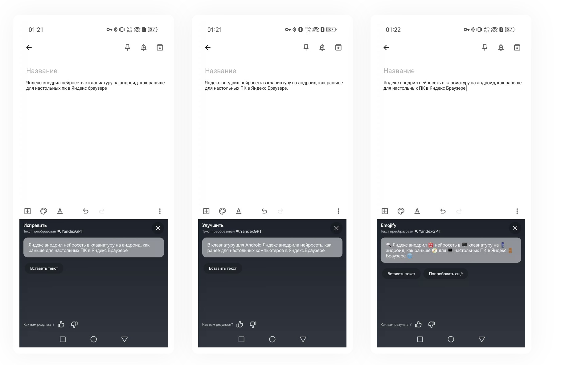 Выглядит это следующим образом. Мы написали пару небрежных предложений, чтобы продемонстрировать, что смогут алгоритмы «Яндекса». Они на заглавном фото к статье. Ниже покажем, как работают все три режима.