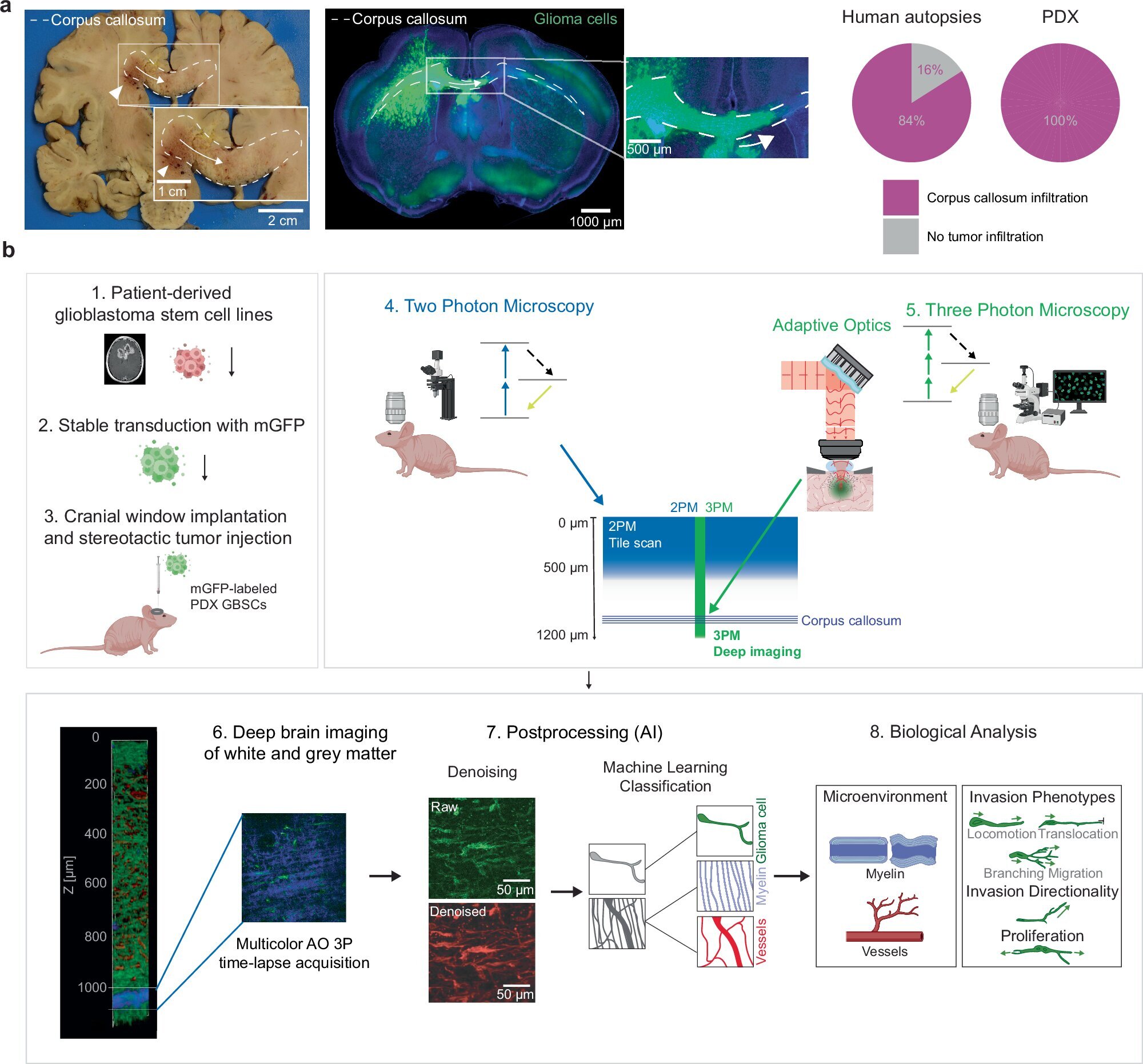Технология, основанная на методах глубокой микроскопии, решает проблему наблюдения за нейронами и другими клетками в глубинных участках мозга, таких как белое вещество мозолистого тела, которое часто поражается при глиобластоме. Исследователи могут теперь наблюдать за живыми клетками, а также различать их микросреду с высокой четкостью.