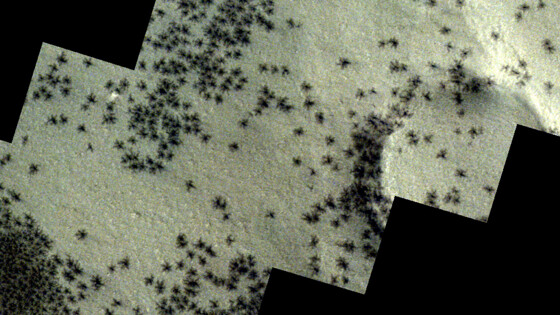 Орбитальные аппараты впервые заметили «пауков» в 2003 году. Сначала эти неподвижные объекты были полной загадкой, но в конечном итоге ученые определили, что пауки образуются, когда лед из углекислого газа на поверхности планеты внезапно сублимируется — превращается в газ без предварительного расплавления в жидкость.