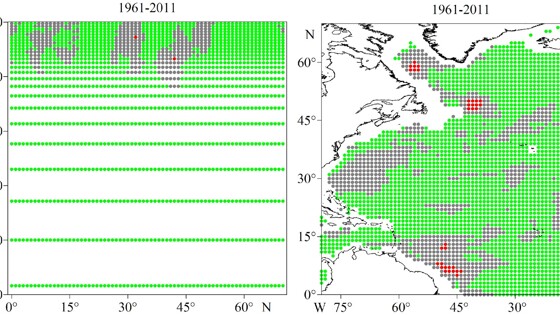 Ученые из Института природно-технических систем (Севастополь) и Института вычислительной математики имени Г.И. Марчука РАН (Москва) проследили, как менялась соленость воды в северной части Атлантического океана с 1948 по 2018 год. Для этого океанологи математически сопоставили восемь баз данных по солености Северной Атлантики. Ученые определили регионы, где все или почти все источники данных согласованно указывают на изменение содержания соли. Кроме того, авторы выявили области, по которым доступных данных оказалось недостаточно для получения однозначных выводов. Проведенный анализ показал, что соленость увеличилась за последние 70 лет в субтропических широтах примерно на 0,07 промилле, а за последние 50 лет в нескольких небольших по площади областях — вблизи Канарских островов, в Гвианском и Лабрадорском течениях, а также в области перехода Гольфстрима в Североатлантическое течение — значительно сильнее, до 0,1 промилле.