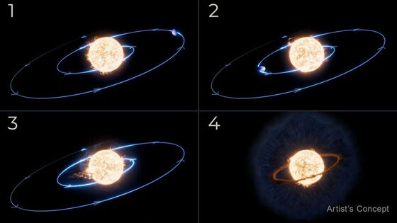 Столкновение породило мощные выбросы пыли и горячего газа, окружившие звезду расширяющимся облаком в виде кольца.