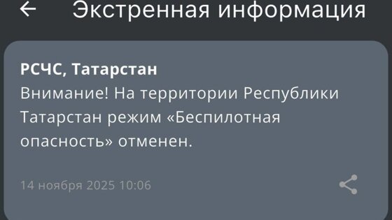 В Татарстане с 10:06 сняли режим беспилотной опасности. Сообщение опубликовано в приложении МЧС.