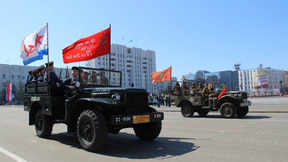 После завершения объезда парадных расчетов войск Хабаровского гарнизона генерал-лейтенант Александр Чайко поздравил собравшихся с праздником Великой Победы в Великой Отечественной войне. В Хабаровске состоялся парад войск Хабаровского гарнизона, посвященный 73-й годовщине Победы советского народа в Великой Отечественной войне. Принимал военный парад исполняющий обязанности командующего войсками Восточного военного округа генерал-лейтенант Александр Чайко. Командовал парадом заместитель командующего войсками военного округа генерал-лейтенант Сергей Соломатин. После завершения объезда парадных расчетов войск Хабаровского гарнизона генерал-лейтенант Александр Чайко поздравил собравшихся с праздником Великой Победы в Великой Отечественной войне. Затем по главной площади краевой столицы торжественным маршем прошли барабанщики Уссурийского Суворовского военного училища, рота почетного караула окружного учебного центра, парадные расчеты штаба ВВО, объединения ВВС и ПВО, отдельного мотострелкового соединения, а также представители воинских частей морской пехоты, специального назначения, железнодорожных войск, курсанты Дальневосточного высшего общевойскового командного училища. Впервые в параде приняли участие 134 военнослужащие-женщины. Всего в составе пеших колонн в параде приняли участие более 1.9 тысяч военнослужащих, представляющих рода и виды Вооруженных Сил России и силовые ведомства, в которых предусмотрена военная служба, в том числе от ВВО более 1,3 тысяч военнослужащих. Впервые на военном параде зрители увидели тяжелую огнеметную систему ТОС-1А, бронетранспортер БТР-82А, армейский мотовездеход АМ-1, УАЗ «Пикап», комплексы РЭБ «Леер-2» и «Инфауна», служебные машины военной полиции. Кроме того, в составе механизированной колонны было задействовано более 100 единиц военной техники, в частности, танки (Т-80, Т-72Б3), боевые машины пехоты (БМП-2), самоходные артиллерийские установки (МСТА-С), бронетранспортеры (БТР-80), противотанковые пушки МТ-12 «Рапира», буксируемые гаубицы 2А65, Д-30, реактивные системы залпового огня «Торнадо-Г», ОТРК «Искандер», ЗРС С-300 ПС, ЗРК «Тор». На территории Восточного военного округа в военных парадах во Владивостоке, Хабаровске, Южно-Сахалинске, Уссурийске, Белогорске, Чите, Улан-Удэ задействовано более 10 тысяч человек, в том числе от министерства обороны России более 7.5 тысяч, а также порядка 330 единиц военной техники.