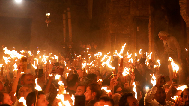 В храме Гроба Господня в кувуклии (часовне над местом, где был, как считается, погребен Иисус) в Иерусалиме сошел Благодатный огонь. Патриарх Иерусалимский Феофил III передал его собравшимся в храме. Они зажгли от нее связки из 33 свечей - по возрасту Христа. Представители делегации Фонда Андрея Первозванного, которые тоже присутствуют в храме, доставят огонь в специальных лампадах спецрейсом в Москву,