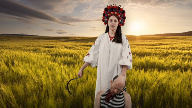 Социальная реклама на Украине: девушка с серпом в народном платье убивает российского солдата