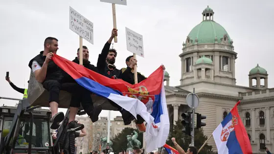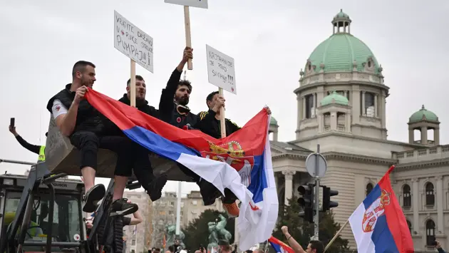 По информации агентства, среди протестующих много молодых людей, некоторые из них держат в руках плакаты и флаги Сербии.